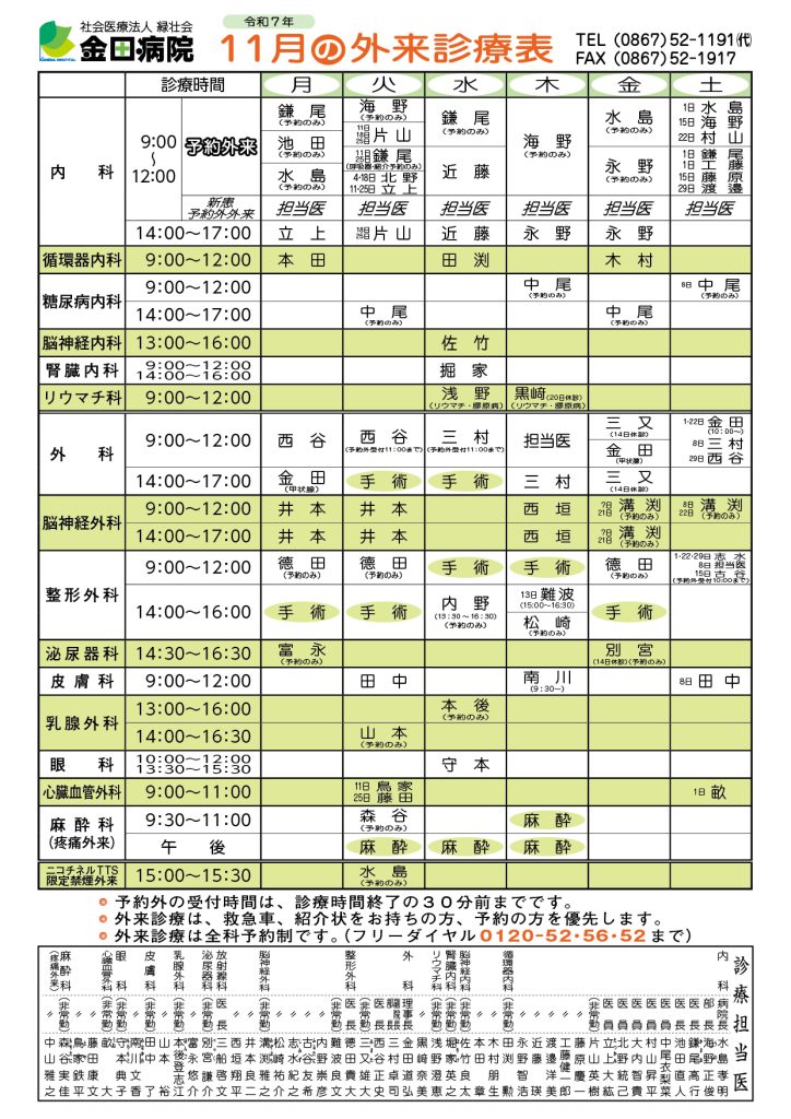 令和7年11月の外来診療表