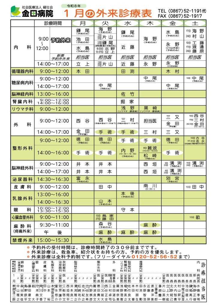 令和8年1月の外来診療表
