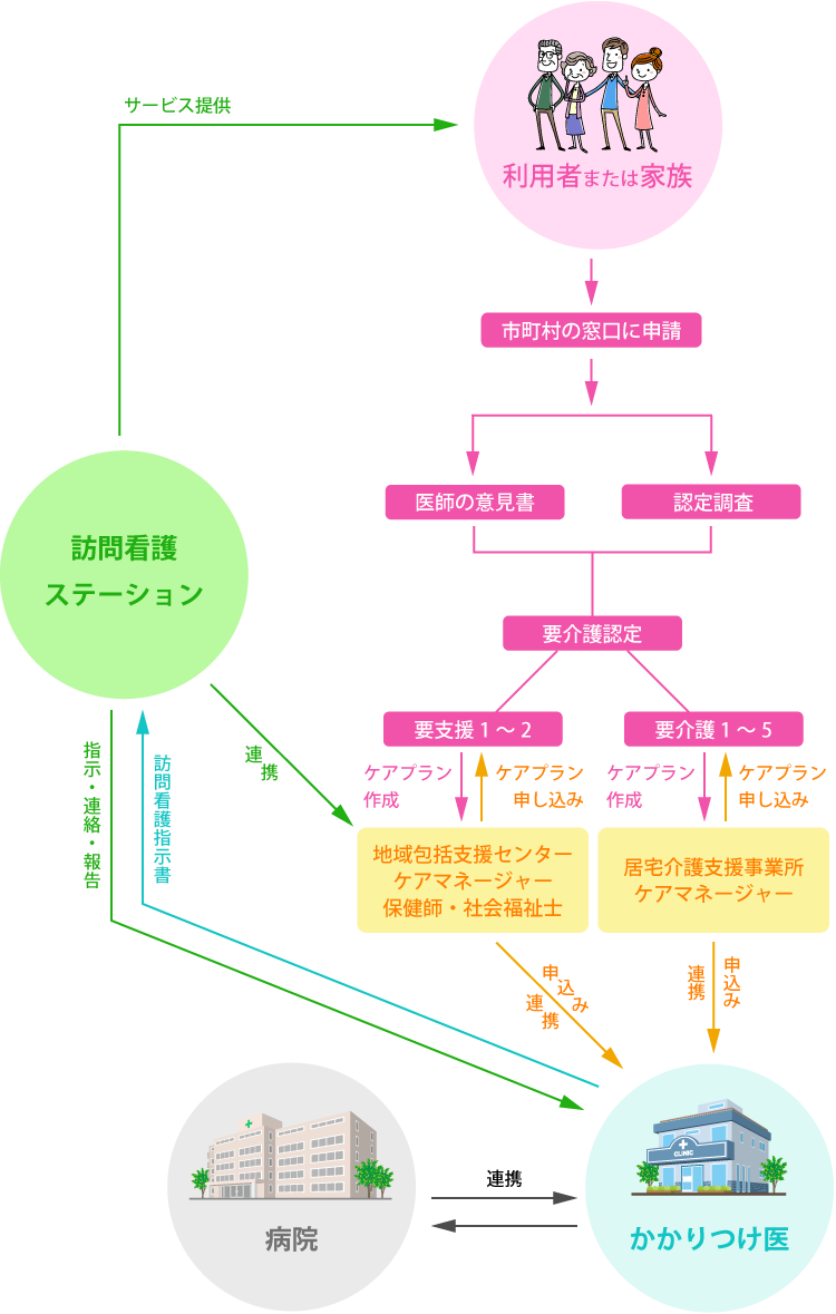 必要に応じて、ケアマネージャーが介護保険の申請代行からサポートいたします。(介護保険利用の全くない方は、居宅介護支援事業所の紹介をいたします。)かかりつけ医が発行する「訪問看護指示書」も手配いたします。そして、ケアマネージャーがケアプランを作成し、利用者様の暮らしを支えるサービス事業所が決まります。